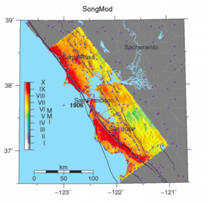 La faille de San Andreas n’est pas la seule capable de frapper fort. Sur la côte californienne, la plaque pacifique glisse le long de la plaque nord-américaine. Ce mouvement se répartit entre plusieurs failles, dont le San Andreas. Le décalage annuel atteint 5 cm, soit environ 2 pouces (Aagaard et Beroza, 2008). Mauvaise nouvelle pour la baie : les scientifiques estiment aujourd’hui que la région accuse un retard de glissement de 4 mètres, soit autant que durant le séisme de 1906 (Schwartz et al., 2014). Si l’on suit cette logique, un nouveau choc du même ordre pourrait survenir pour combler ce déficit.