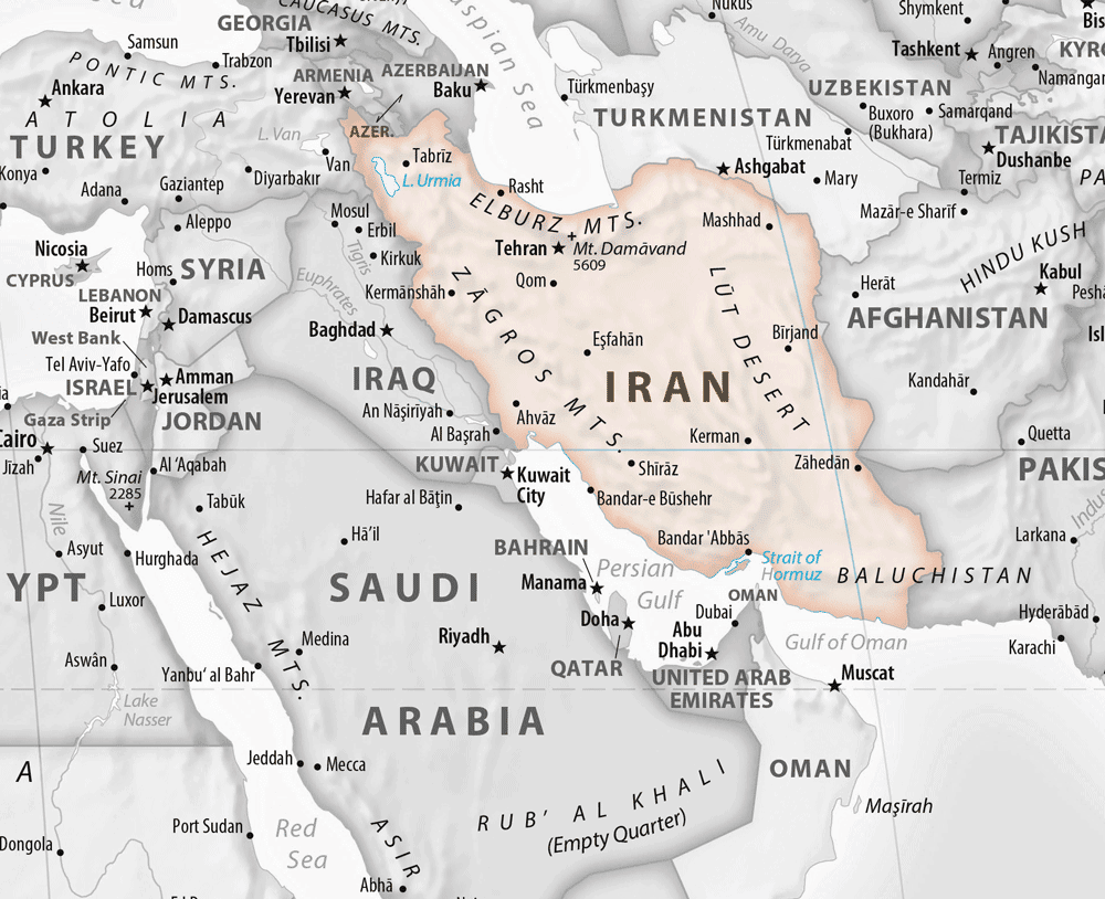 Carte montrant l’emplacement de l’Iran au Moyen-Orient. Carte de Equal Earth, domaine public. L’Iran partage une frontière avec sept pays différents :